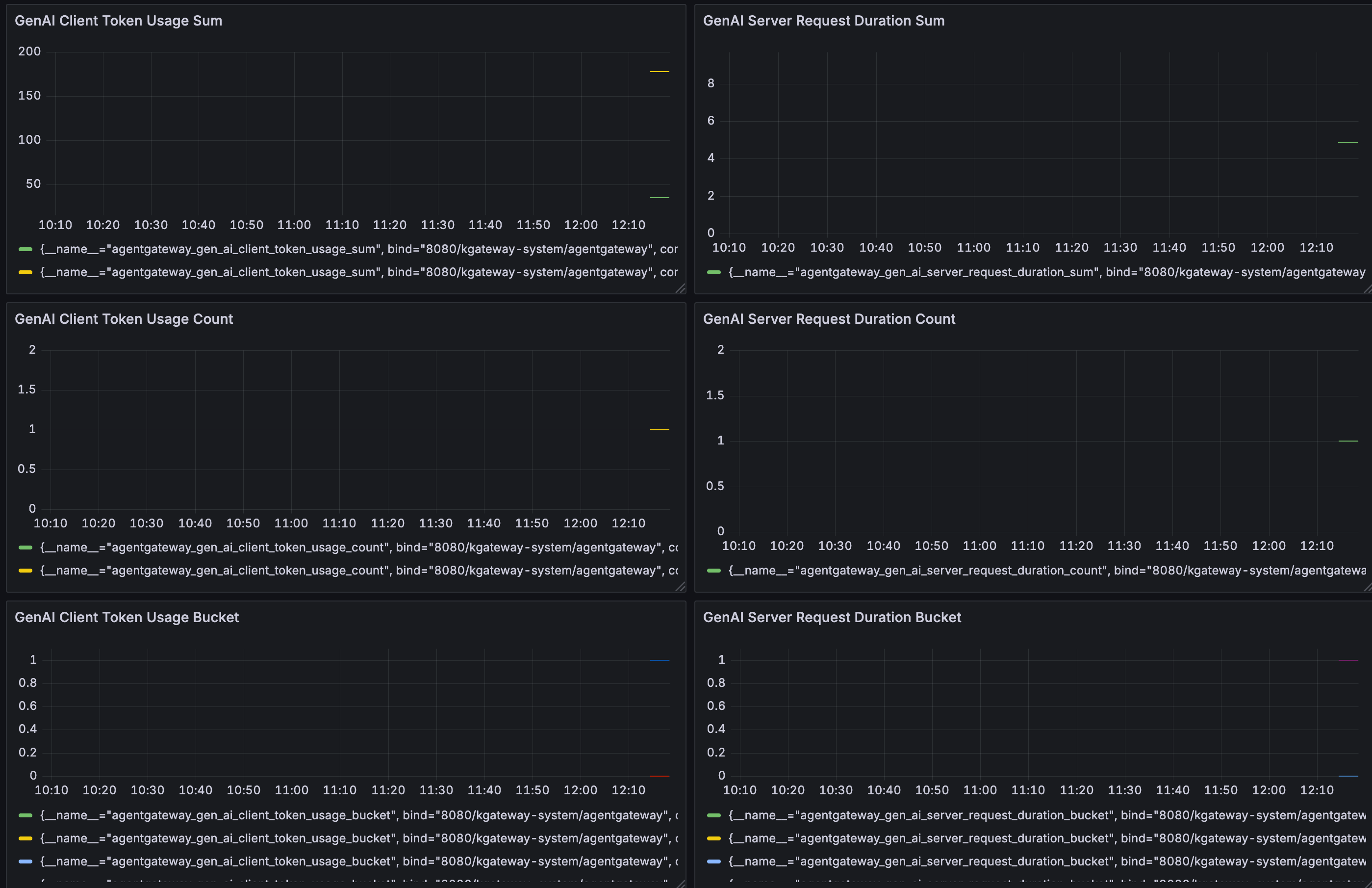 • agentgateway_gen_ai_server_request_duration - Measures total duration of each generative AI request on the server side. Observing total latency per LLM request (including input processing + generation).