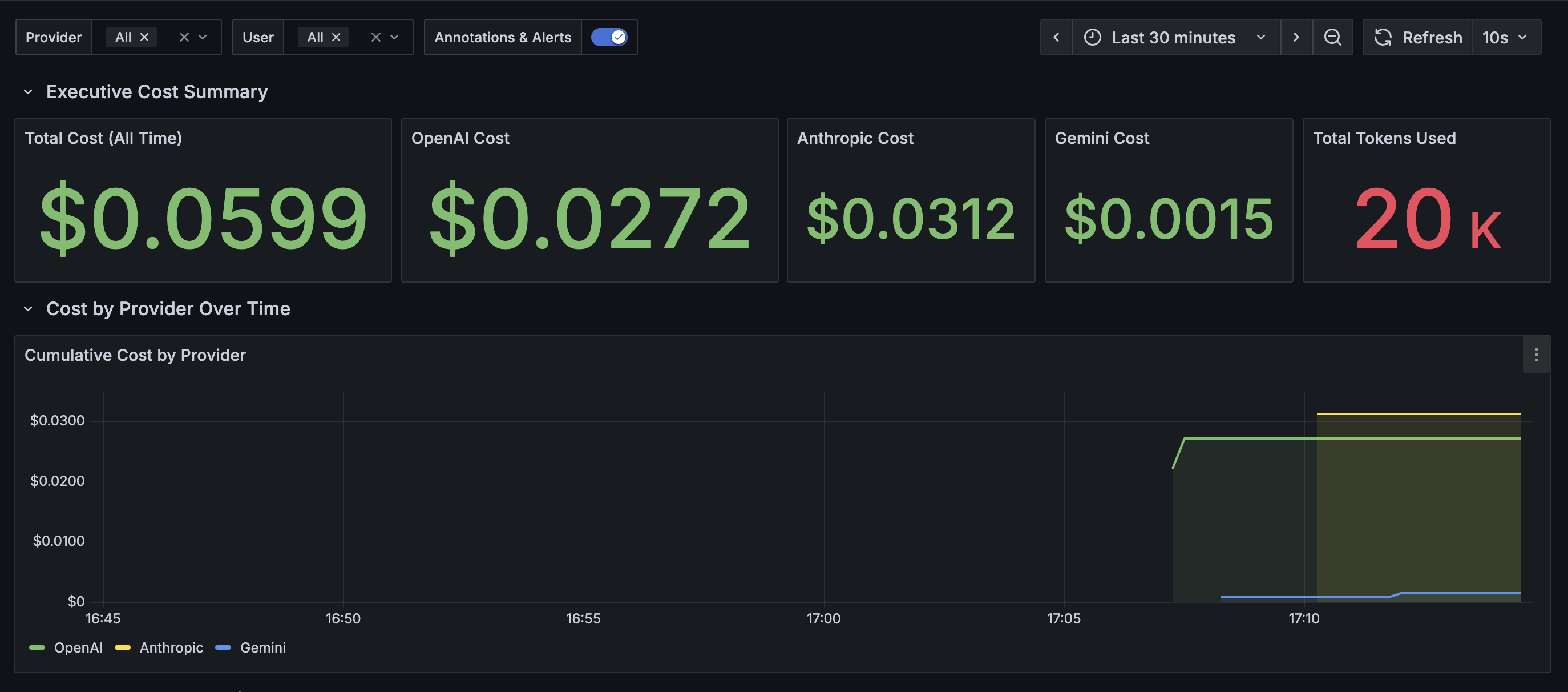 • Latency and Time-to-First-Token Trends – Detect degradations or regressions in model responsiveness across providers.